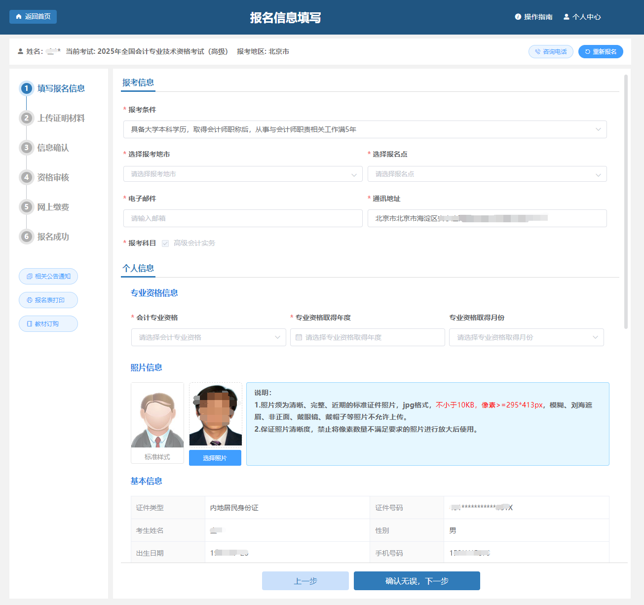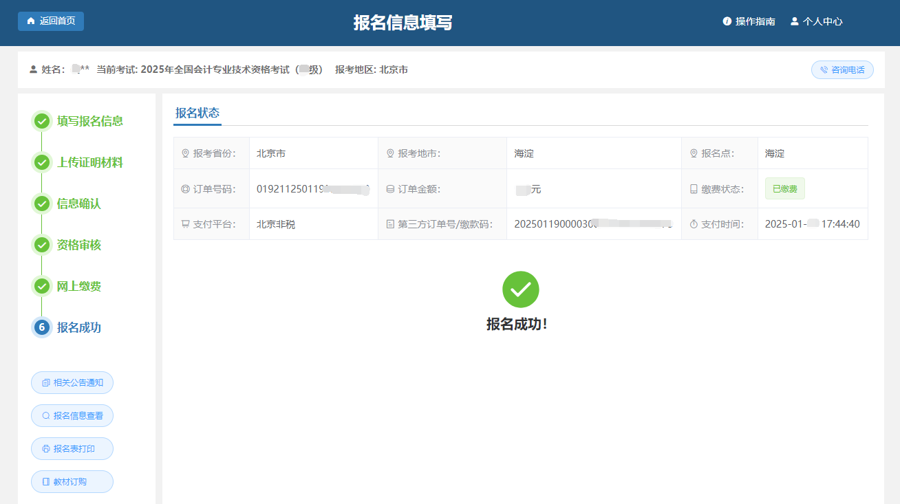 按提示要求,上传证明材料,信息确认,资格审核通过,网上缴费成功,即报名成功!